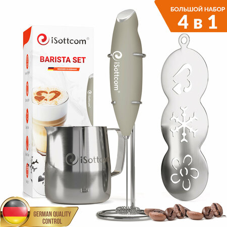 Теперь для вас не составит труда сделать пышную и стойкую пену для капучино или латте или фраппе или порадовать своих домашних нестандартной подачей молока, кофе, коктейлей, детских смесей, спортивного питания. Стильный набор состоящий из капучинатора, питчера и трафаретов может украсить Ваше утро и не только! Вспениватель молока от iSottcom позволит за несколько секунд приготовить пышную молочную пенку. За ним удобно ухаживать, он легок во время чистки, не скользит в руках и его легко найти среди другой кухонной техники, когда он срочно нужен. Разработан в Германии и изготовлен под контролем немецкой компании Vymana GmbH из высококачественных материалов. Идеальная подача кофе теперь легко вместе с iSottcom! Ключевые преимущества нашего Barista Milk Frother Set: ✅ Капучинатор. Сделайте густую молочную пену за считанные секунды с электрическим вспенивателем молока. Наш беспроводной капучинатор придаст профессиональный вид вашему латте, капучино, макиато или горячему шоколаду. За ним легко ухаживать и мыть. Ручной капучинатор удобен в использовании, эргономичная ручка, не скользит в руке, удобно брать с собой. Мощный и эффективный двигатель поможет взбить молочную пенку за считанные секунды, работает со всеми видами молока и сливок. Изготовлен из высококачественной нержавеющей стали и ABS пищевого пластика. Также, есть подставка, которая решает проблемы с хранением. Главное преимущество наличия нашего набора - это безграничные возможности приготовления напитков на свой вкус. Используйте наш мини миксер для смешивания и взбивания матчи, коктейлей и спортивных напитков ✅ Питчер. Металлический питчер для молока удобен в использовании, практичен. Широкая ручка за которую удобно держаться. У питчера для молока большой обьем до 300 мл. хватит, чтобы взбить много молочной пены. Внутри нанесена мерная шкала для точного измерения объема жидкости для взбивания. Удобный носик предназначается для аккуратного выливания молока и хорошо подходит для рисования узоров латте-арт. ✅ Трафареты. Трафареты для кофе из нержавеющей стали это простейший способ украсить свой напиток. Вы можете украсить молочную пену с помощью какао, шоколада, корицы и получить не только вкусный, но и красивый напиток для себя и своих близких. ✅ Идеально в подарок. У нашего набора с капучинатором современный продуманный до мелочей дизайн, покупая его вы получаете незабываемые эмоции, возможность проявить свою креативность, удивить своих близких не только вкусными, но и красивыми напитками. При хранении прекрасно сочетается с кофейными принадлежностями. Товар производится по европейским стандартам качества под контролем немецкой фирмы Vymana GmbH. ✅ Гарантия. Мы используем только высококачественные материалы. Наш капучинатор, питчер и трафареты прослужат долго, не сломаются и не заржавеют. Никаких хлопот с гарантией, мы любим и гордимся нашим товаром, поэтому при его покупке Вы можете быть уверены, что он прослужит Вам долго. Если возникнут какие-либо проблемы, просто свяжитесь с нами, и мы все исправим. Закажите сейчас и будьте уверены, что этот продукт будет соответствовать вашим ожиданиям.