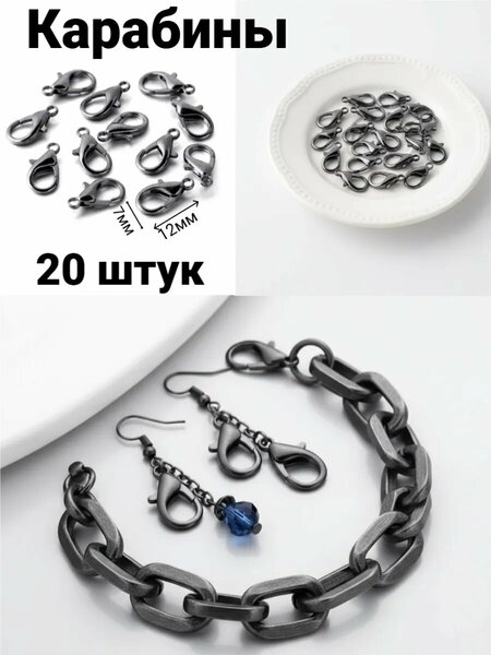 Карабины для бижутерии из бижутерного сплава Эти элегантные и надежные карабины станут незаменимым элементом вашей коллекции аксессуаров для бижутерии! Назначение: Используются для создания оригинальных украшений, включая браслеты, колье, бусы и подвески. Подходят для быстрого соединения элементов и удобны в эксплуатации. Особенности: Универсальные размеры: идеально подходят для большинства видов украшений. Удобный механизм: фиксация осуществляется простым движением руки, обеспечивая надежную защиту от случайного расстегивания. Высококачественный сплав: материал устойчив к коррозии и долговечен, сохраняя первоначальный внешний вид надолго. Преимущества: Простота установки: легко прикрепляются к любой основе, будь то нить, шнур или цепь. Стильный дизайн: придают изделию законченный и профессиональный вид. Практичность: позволяют быстро менять элементы декора, создавая новые образы. Создавайте красивые и качественные украшения с нашими карабинами из бижутерного сплава! Наслаждайтесь процессом творчества и удивляйте окружающих уникальными аксессуарами собственного производства