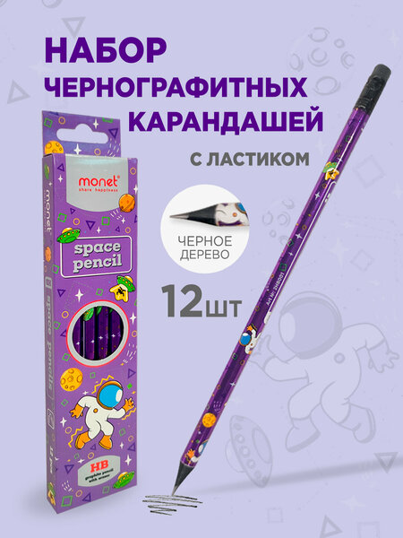 Набор карандашей Monet "Space", чернографитные, с ластиками, 12шт, фиолетовый корпус