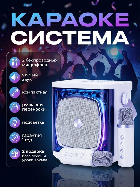 Представляем караоке систему нового поколения для яркого музыкального настроения! Откройте мир удовольствия с универсальной блютуз колонкой, созданной для всей семьи! Мини музыкальная система с мощным звуком станет вашим лучшим выбором для проведения вечеров дома, на даче или даже на природе. Громкая и качественная музыка - миниколонка поддерживает стерео-воспроизведение и работает на аккумуляторе, чтобы ваш праздник не останавливался. Два беспроводных микрофона - удобное решение для совместного пения с друзьями, партнером или детьми. Пусть ваш вокал будет слышен везде! Подключайте ваш телефон, планшет или другой девайс через bluetooth и выбирайте любимые треки без лишних проводов. Компактная и легкая в использовании караоке система станет вашей верной спутницей на праздниках! Независимо от того, это домашний вечер, поездка на природу или день рождения ребенка. Забудьте про скуку - яркая подсветка добавит нотку волшебства в любое событие. Идеально подходит как для взрослых, так и для детей. Добавьте веселья в ваши выступления с функцией изменения голоса. Переключайте голосовые эффекты, чтобы сделать любое исполнение ещё ярче. Подарите себе и вашим близким настоящую радость. Эта домашняя музыкальная система — ваш центр веселья, который сделает любой день запоминающимся!