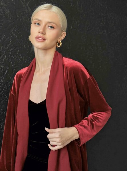Бархатный кардиган с шифоновой отделкой — универсальная вещь для праздничных и повседневных образов. Свободный силуэт в сочетании с легким поясом-шнурком позволяет подчеркнуть талию или оставить кардиган распахнутым для непринужденного стиля. Отделка из нежного шифона добавляет изделию изысканности и легкости, делая его идеальной накидкой для особых случаев. Такой кардиган может заменить привычный жакет, гармонично дополняя платья, юбки или вечерние комплекты. В повседневной жизни кардиган станет вашим любимым аксессуаром: он отлично сочетается с майками, тонкими джемперами и футболками. Свободный крой визуально вытягивает силуэт, добавляя образу нотки богемности. Кардиган выполнен из натуральных материалов, что гарантирует комфорт и долговечность.