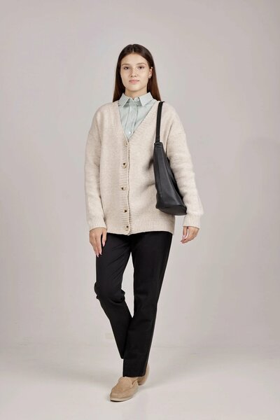 Мягкий уютный кардиган с V-образным вырезом и застежкой на пуговицы. Свободный крой и прямые длинные рукава помогут скорректировать силуэт фигуры и прибавят комфорта в движениях. Отличный вариант для сочетания в повседневных и офисных образах.