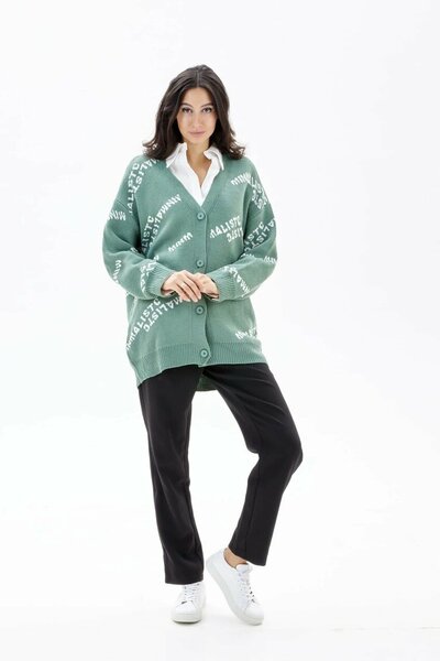 Удлиненный кардиган свободного кроя в крупный текстовый принт. Имеет глубокий V-образный вырез и застежку на пуговицы в тон. Отличный вариант для сочетания в повседневных и офисных образах.