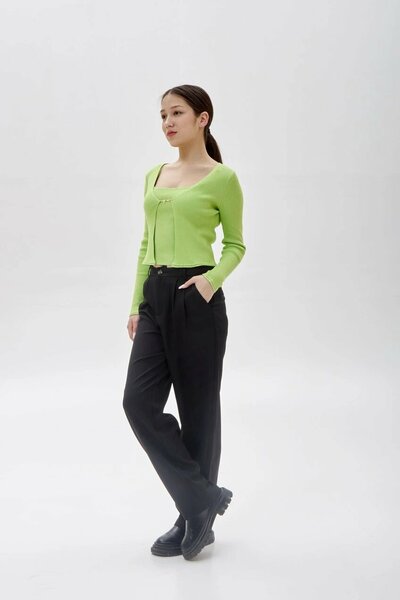 Укороченный кардиган полуприлегающего кроя с V-образным вырезом. Выполнен из приятного к телу фактурного трикотажа в рубчик. Для создания комплекта сочетайте с соответствующим топом в тон.