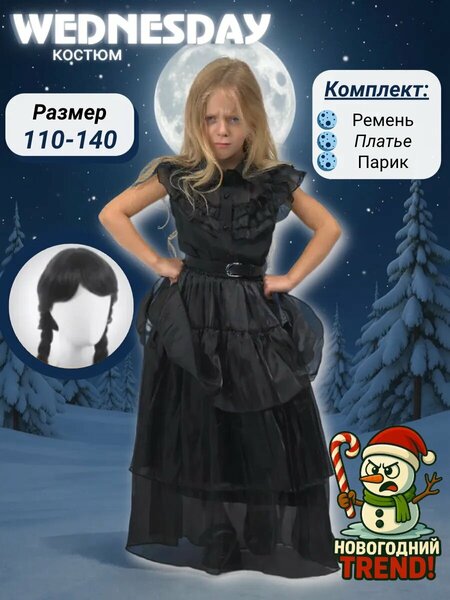 Карнавальный костюм Уэнсдей с париком Если вы закажете наше карнавальное платье Уэнсдей, то получите в подарок парик и ремень! Парик с челкой, заплетенный в косички, идеально дополнит образ! Длина косичек составляет 45 см. Нарядное готическое платье Уэнсдей с А-силуэтом и пышной ярусной юбкой будет отлично смотреться на любой фигуре. Пышная юбка и рюши на лифе придадут особый шарм вашему образу. Ткань платья не скатывается, не мнется и не колется, а его основа выполнена из приятной на ощупь атласной ткани. Верх лифа изготовлен из мягкой сетки. В этом стильном и красивом платье Уэнсдей ваша девочка будет чувствовать себя комфортно круглый год и на любом мероприятии в готическом стиле. Оно отлично подойдет для фотосессии в стиле Семейка Аддамс. Платье для подростка выполнено в соответствии с последними модными тенденциями и станет отличным выбором для любого праздника, будь то выпускной в школе, утренник в садике, Новый год или День рождения. Готический наряд Уэнсдей для Хэллоуина станет любимым в гардеробе вашей модницы.