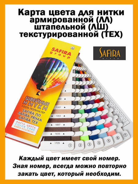 Карта цвета для швейных ниток SAFIRA (Сафира): армированных «SAFIRA ЛЛ», штапельных «SAFIRA PRIMA (ЛШ)», текстурированных «SAFIRA ТЕХ». С помощью карты цвета очень удобно выбирать необходимый цвет и оттенок. Каждый цвет имеет свой номер, артикул. Зная артикул, вы можете заказывать повторно один и тот же цвет.
