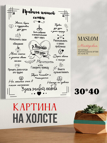 Картина для дома "Правила нашей семьи", на холсте, 30*40 см, А3 формат, белый
