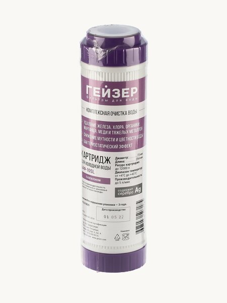Картридж БАФ 10SL выполняет комплексную очистку воды механическим, сорбционным и ионообменным способами. БАФ – это сорбционный картридж, сорбционные свойства которого усилены применением современных сорбентов, дополнены ионообменной способностью, благодаря чему очистка воды становится более интенсивной и комплексной. Высокоэффективный картридж для фильтра воды Гейзер содержит мультикомпонентную загрузку, включающую ионообменные материалы и сорбенты. В составе гранулированный посеребренный активированный уголь, волокнистый углеродный сорбент (ММВ) с повышенной сорбционной способностью, ионообменное волокно Каталон с внедренными в его структуру ионами серебра и микрочастицами угля. Картридж для фильтр БАФ 10SL очистит воду от остаточного хлора, органических соединений и железа (рекомендованное содержание Fe – не выше 2 мг/л). Мультикомпонентный фильтрующий картридж для воды также извлекает твердые частицы, хлорорганические соединения, бензол, фенол, нефтепродукты, пестициды, медь, марганец, ртуть, ионы тяжелых металлов, мутность, цветность, неприятные привкусы, запахи и другие вредные примеси, выполняет кондиционирование воды, улучая её вкус и запах. Универсальный картридж для воды Гейзер БАФ отличается высоким ресурсом водоочистки: он сохраняет эффективность при среднесуточном потреблении воды 7 л на протяжении 300 дней. Ресурс эксплуатации без забивания – до 12 000 л. Картридж для воды 10SL БАФ предназначен для магистральных и бытовых фильтров стандарта 10SL (Slim Line), может устанавливаться в корпуса любых производителей. Фильтрующий элемент подходит для использования как в качестве одноступенчатого фильтра, так и в составе фильтрационной системы на второй и третьей ступени. В линейке Гейзер он устанавливается на последней ступени трехступенчатого фильтра «Классик» и второй ступени фильтра «Гейзер Стандарт» для мягкой воды, на третьей ступени фильтров «Классик» и «Гейзер Стандарт» для жесткой воды, третьей ступени «Классик» для железистой воды. Технические характеристики: • Температура очищаемой воды 4-40°С • Ресурс до 12 000 литров (зависит от качества воды) • Типоразмеры (высота/диаметр), SL10” (Ø 73 мм) • Срок хранения картриджа 3 года (дата производства на этикетке) • Производство россия