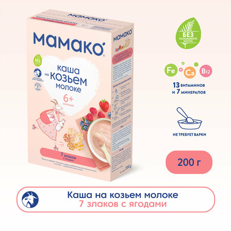 ➢ Молочная каша 7 злаков MAMAKO с ягодами быстрого приготовления рекомендована для прикорма с 6 месяцев. Когда в рацион уже введены овощи, фрукты и все злаки, пора знакомить малыша с лакомыми кашами! Каша с фруктами и овощами легкой кремовой консистенции дает все самое ценное для энергии и роста. Почему каша МАМАКО так нравится малышам и мамам? Все просто: ✓ Нежно-сливочное натуральное козье молоко — легко усваивается. ✓ Отборные мультизлаки богаты витаминами группы B и пищевыми волокнами, а спелые клубника, малина и черника превращают ее в настоящее лакомство. ✓ Каша не требует варки, разводится быстро и без комочков. Каши МАМАКО — это разнообразное злаковое меню, каждый день с новой кашей для здоровья и активности малыша! • Без ГМО • Цельное зерно • Без крахмала • Без пальмового и других добавленных растительных масел • Без ароматизаторов, консервантов, красителей