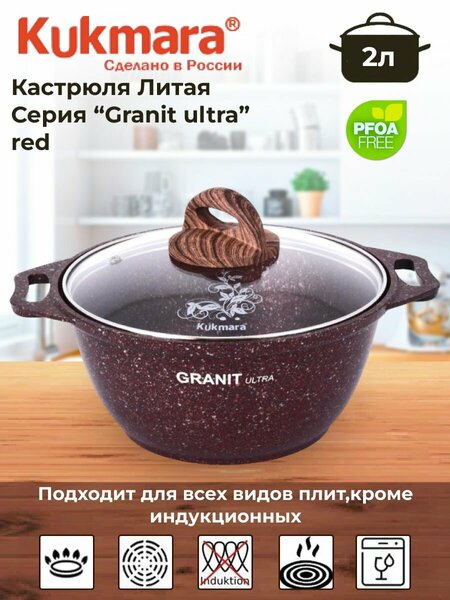 Кастрюля "Kukmara" изготовлена из литого алюминия и покрыта уникальным ультрапрочным антипригарным покрытием «Ultra granit». «Ultra granit» - это инновационное невероятно прочное покрытие, усиленное сверхтвердыми минералами нового поколения, близкими по твердости алмазу. Благодаря особой технологии прочность покрытия позволяет использовать даже металлические кухонные принадлежности, не боясь повредить поверхность. Покрытие «Ultra granit» продлевает срок службы посуды более чем в 7 раз! Особенности кастрюли "Kukmara": значительная толщина стенок и дна исключает деформацию корпуса кастрюли, гарантирует ее долговечность, обеспечивает необходимую прочность покрытия; прочное покрытие, усиленное сверхтвердыми минералами нового поколения, близкими по твердости алмазу; экологически безопасное антипригарное покрытие без содержания PFOA;