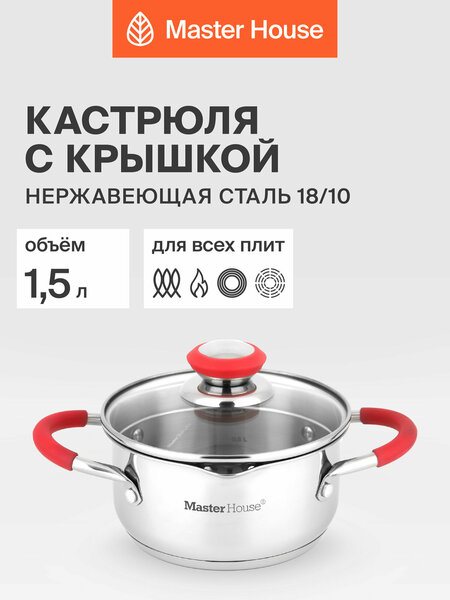 Кастрюля линейка коллекция Россе из высококачественной нержавеющей стали с толстым дном объемом 1,5л отлично подходит для варки яиц, приготовления маленьких порций блюд (детская каша, соус). Толстые стенки из нержавеющей стали (0,6мм) и капсулированное дно с алюминиевой вставкой (толщина 3мм) обеспечивают быстрое нагревание и равномерное распределение тепла. Кастрюля линейка коллекция Россе объемом 1,5л подходит для всех видов плит, включая индукционную. Кастрюля изготовлена из нержавеющей стали марки 18/10. Сталь 18/10 не ржавеет, не меняет вкус продуктов, безопасна для здоровья. Кастрюля из нержавеющей стали легко моется. На нержавеющую сталь Master House дает гарантию 25 лет. Кастрюля линейка коллекция Россе укомплектована стеклянной крышкой со специальными отверстиями на металлическом ободке, которые обеспечивают удобный слив жидкости без использования дуршлага. На внутреннюю поверхность кастрюли нанесены отметки литража. Кастрюля и крышка оснащены эргономичными стальными ручками с ненагревающимися силиконовыми вставками. Кастрюля надежно упакована в индивидуальную подарочную коробку. Кухонная посуда – это полезный подарок на новоселье или любой другой праздник.