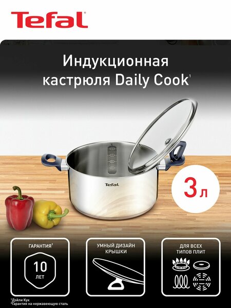 Кастрюля 3 л 20 см Tefal Daily Cook G7124445 с крышкой, из нержавеющей стали, с мерной шкалой, для всех типов плит, включая индукционные, гарантия на нержавеющую сталь 10 лет