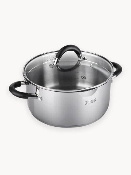 Кастрюля TalleR TR-17194 «Телфорд» объём 4 л (старый артикул TR-7194) Размеры: 22 х 11 см (диаметр х высота без крышки). Толщина стенки - 0,6 мм, толщина дна - 2,8 мм. Полировка внешняя - комбинированная, что создает уникальный внешний вид кастрюли, внутренняя - матовая. Крышка из жаропрочного стекла с отверстием для выхода пара и широким металлическим ободком с отверстиями для слива жидкости. Форма края кастрюли предусматривает желобок для удобного слива жидкости. Ручки из нержавеющей стали с силиконовыми вставками. Есть отметки литража. Пригодна для мойки в посудомоечной машине. Не рекомендуется использовать в духовом шкафу. Подходит для всех типов плит (включая индукционную).