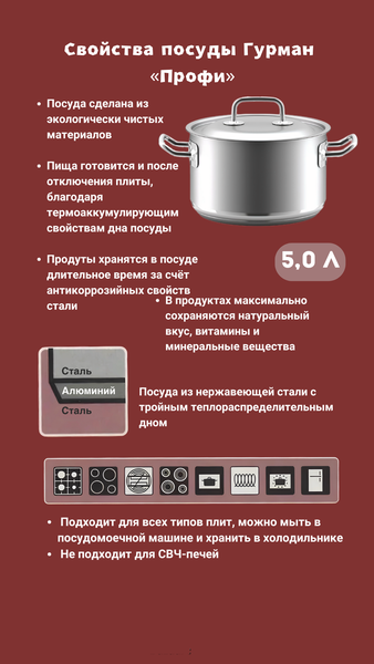 Кастрюля 5,0 л из нержавеющей стали AISI304L. Внутренняя и внешняя поверхность хорошо отшлифована, подходит для повседневного профессионального использования в кафе, ресторанах и дома. Кастрюля создаёт эффект приготовления в русской печи. Кастрюлю можно использовать на всех типах плит, в духовом шкафу, посудомоечной машине. Приготовленные блюда можно хранить в холодильнике. Не выделяет вредные вещества. Кастрюля имеет тройное капсулированное дно (нержавеющая сталь-алюминий-нержавеющая сталь), изготовленное методом диффузионной сварки. Посуда из нержавеющей стали производится на Урале, в Свердловской области, в г. Верхняя Салда с 1992 года. Посуда ВСМПО соответствует ГОСТ 27002-2020.