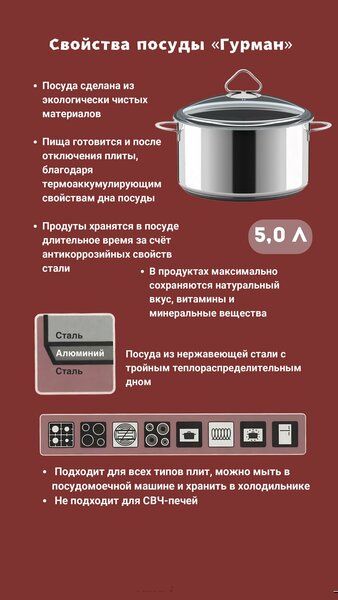 Кастрюля 5,0 л из нержавеющей стали AISI304L. Крышка из боросиликатного стекла, страна производства Чехия. Кастрюля создаёт эффект приготовления в русской печи. Кастрюлю можно использовать на всех типах плит, в духовом шкафу, посудомоечной машине. Приготовленные блюда можно хранить в холодильнике. Не выделяет вредные вещества. Кастрюля имеет тройное капсулированное дно (нержавеющая сталь-алюминий-нержавеющая сталь), изготовленное методом диффузионной сварки. Посуда из нержавеющей стали производится на Урале, в Свердловской области, в г. Верхняя Салда с 1992 года. Посуда ВСМПО соответствует ГОСТ 27002-2020.