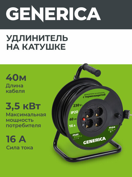 Катушка УК40 с термозащитой от Generica - это надежное и функциональное решение для подключения электрооборудования. Катушка оснащена ударопрочным термоустойчивым пластиковым барабаном, который обеспечивает долговечность и защиту от перегрева. Устойчивая стальная рама гарантирует стабильность и надежность конструкции. Термовыключатель на катушке защищает от перегрузки и обеспечивает безопасность использования. Прорезиненная эргономичная ручка обеспечивает удобство и комфорт при использовании. Технические характеристики катушки включают 4 розетки, 3-жильный кабель длиной 40 метров и сечением 1,5 мм2. Максимальная мощность в размотанном состоянии составляет 3500 Вт. Выключатель на корпусе и термовыключатель обеспечивают удобство и безопасность использования. Степень защиты IP20 гарантирует защиту от пыли и влаги. Катушка УК40 с термозащитой от Generica - это надежный и функциональный удлинитель, который станет незаменимым помощником в вашем доме или на рабочем месте.