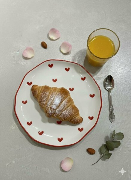 Керамическая десертная тарелка с принтом «Маленькие сердца» и красным кантом (20 см) Характеристики товара: Стиль: Прованс, скандинавский уют (hygge). Детали: Белая глянцевая глазурь, неровный «крафтовый» край (organic edge), минималистичный паттерн из мелких красных сердечек по периметру, тонкая красная кайма. Назначение: Идеальна для завтраков, подачи выпечки (круассанов) и создания романтической сервировки. Очень красивый элемент изящной жизни