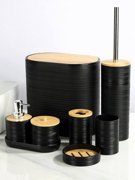 Этот набор из 6 керамических аксессуаров для ванной сочетает стиль и функциональность. Предметы изготовлены из прочной керамики, устойчивают к воздействию влаги и долговечны. Благодаря различным элементам — дозатору, мыльнице, подставкам для щёток и других мелочей — вы легко организуете порядок в ванной комнате. Чёрный цвет гармонирует с современным интерьером. Отличный выбор для дома, гостиницы или салонного пространства. Набор: 6 предметов из керамики Цвет: чёрный Материал: качественная керамика Для гигиенических принадлежностей Добавляет порядок и стиль в ванную Лёгкий уход и очищение