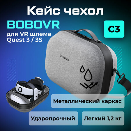 BOBOVR C3 Carrying Case кейс для шлема виртуальной реальности — именно тот аксессуар, который вы точно захотите добавить в свою коллекцию. Преимущества кейса BOBOVR C3: • Эргономичный дизайн: Кейс легко носить в руке благодаря прочной ручке и вместительному дизайну. • Высококачественный материал: Основной корпус выполнен из прочного материала с толщиной 6 мм. Все участки, подвергающиеся наибольшей нагрузке, усилены металлическими элементами, обеспечивая надежную защиту вашего шлема во время переноски. • Вместительность: Этот кейс специально разработан для Oculus Quest 3, идеально подходит для крепления BOBOVR S3 Pro, а также для фирменной док-станции и аккумуляторов. • Дополнительные отсеки для аксессуаров: В кейсе предусмотрены специальные места для хранения контроллеров, кабелей и других аксессуаров, что делает его идеальным решением для повседневного хранения VR-шлема или путешествий. • Привлекательный внешний вид: Кейс имеет элегантный дизайн, который не только обеспечивает надежную защиту вашего оборудования, но и подчеркнет индивидуальный стиль. Специально разработанная жесткая внешняя оболочка с амортизирующей внутренней подкладкой обеспечивает защиту от ударов, царапин и пыли. Кейс BOBOVR C3 Carrying Case для Oculus Quest 3 надежно защищает ваше VR-устройство в поездках и обеспечивает удобное и организованное хранение дома, поддерживая порядок и легкий доступ к VR-оборудованию.