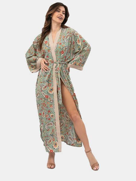 Элегантный халат-кимоно из вискозного шелка — стиль и комфорт в любой ситуации Погрузитесь в атмосферу восточной гармонии и уюта с нашим изысканным халатом-кимоно. Легкий и приятный к телу материал — вискозный шелк — обеспечивает невероятный комфорт, а яркий этнический принт добавит в ваш образ нотки экзотики и индивидуальности. Этот универсальный халат станет настоящей находкой: • Используйте его как домашнюю накидку, чтобы чувствовать себя красиво даже в повседневной обстановке. • Надевайте его поверх купальника на пляж или у бассейна — он заменит парео и станет стильным акцентом вашего летнего образа. • Идеален для путешествий, поездок в роддом или отпусков — легкий, компактный и всегда уместный. • Отлично подходит на подарок — универсальный размер и фасон делают его безупречным выбором для женщин с любым типом фигуры. Свободный крой с запахом и поясом умело подчеркивает достоинства и скрывает недостатки. В таком халате вы будете выглядеть стильно и уверенно в любой ситуации — будь то домашний уют или встреча гостей. Рекомендации по уходу: стирать в деликатном режиме, чтобы надолго сохранить красоту ткани и яркость рисунка. Позвольте себе немного роскоши каждый день — выберите халат, в котором чувствуешь себя женщиной!