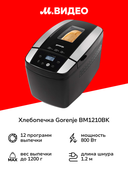 C хлебопечкой Gorenje BM1210BK вы приготовите хрустящие буханки весом до 1,2 кг. Радуйте своих домашних только вкусной и натуральной пищей! простота контроля Выставляйте все необходимые настройки нажатием кнопок на панели управления. А вся важная для эксплуатации информация отразится на чётком дисплее. большие возможности Кухонная помощница не только выпекает в 12 режимах, замешивает тесто, но и позволяет регулировать цвет корочки. Не употребляете в пищу глютен? Тогда просто используйте муку без клейковины – всё остальное Gorenje BM1210BK возьмёт на себя. Любители же сладкого легко сделают тающий во рту кекс. точно пригодится Любите есть горячий хлеб? Выбирайте функцию поддержания тепла или подогрев. Отложенный старт позволит запланировать включение модели в любое время в течение ближайших 13 часов. обратите внимание Съёмная форма снабжена качественным антипригарным покрытием, поэтому к ней ничего не прилипнет. В крышке есть смотровое окошко, чтобы вы свободно следили за процессом подрумянивания. Устройство очень устойчиво даже на поверхности скользкого стола благодаря прорезиненному основанию. ВСЁ продумано Если у вас вдруг отключили электричество, но спустя пару минут оно снова появилось, то выбранная программа продолжится самостоятельно. Отсек для сетевого шнура обеспечивает наиболее компактное хранение. полный комплект Прибор поставляется с удобным мерным стаканом, ложечкой и лопастью для перемешивания ингредиентов теста. Ещё есть книга рецептов, с которой вы попробуете не одно новое блюдо.