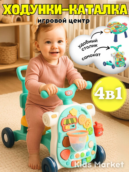 Многофункциональный игровой центр 4 в 1- это ходунки для малыша, детский развивающий столик, а также самокат и каталка с ручкой. Развивающий центр может трансформироваться в разные игрушки в процессе взросления малыша и не терять свою актуальность. Детский игровой центр оснащен панелью в виде бизиборда. На ней расположено множество развивающих предметов, которые активно привлекают внимание малыша. Эта развивающая игрушка поможет познакомить малыша с разными цветами и формами, будет способствовать развитию тактильных ощущений, мелкой моторики, внимания и логического мышления. Игровой центр можно преобразовать в игровой стол со звуковыми эффектами. На съемной игровой панели находится звуковой модуль в форме пианино. Также есть баскетбольное кольцо, крутящиеся шестеренки и сортировщик. В комплект также входят три шарика. Звуковой модуль обладает следующими функциями: 4 веселые мелодии, 6 мелодий для сна, 4 музыкальные ноты и два уровня громкости. Он работает от трех батареек типа “АА” (в комплект не входят). У ходунков в комплекте есть специальный резервуар в форме короны, которую можно наполнить водой или песком, для устойчивости конструкции. Резервуар крепится к внутренней стороне игровой панели. Для безопасности и устойчивости ходунки имеют функцию блокировки задних колёс и противоскользящие полоски на каждом колесе. Многофункциональный развивающий центр - мечта не только малышей, но и родителей. Развивающая игрушка - отличный подарк на день рождения малышу или просто для радости!