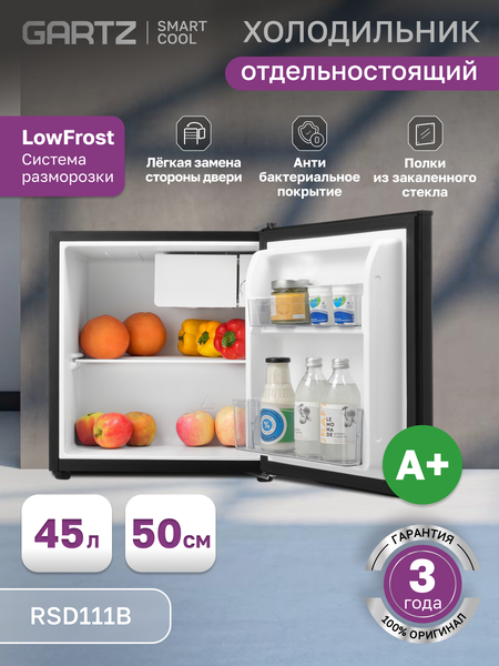 Компактный холодильник мини RSD111B — стильное решение для дома, офиса или дачи, отеля или апартаментов. Его элегантный черный корпус отлично впишется в любой интерьер, а полезный объем 42 литра обеспечит комфортное хранение продуктов и напитков. Три удобные полки из закаленного стекла и пластика, нулевая зона свежести на 5 литров, а также перенавешиваемая дверь делают модель особенно функциональной. Система охлаждения с LowFrost (капельной) технологией надежно сохраняет свежесть продуктов, при этом управление максимально простое — механическое. Холодильник работает тихо (всего 38 дБ), экономично (энергокласс A+) и абсолютно безопасно — с антибактериальным покрытием и уплотнителем. Идеален как дополнительный холодильник или для ограниченного пространства!