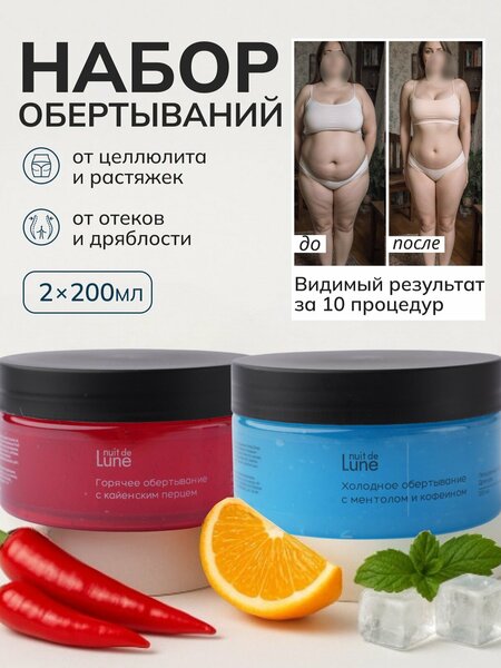 Холодное и горячее обертывание для тела Nuit de Lune 200мл каждая баночка - идеальный подарок на восьмое марта для себя или подарок подруге. Эта уникальная косметика, с ментолом и кофеином и перцем, сочетает в себе крем для тела и антицеллюлитный крем, что делает его отличным средством для похудения и ухода для тела. Наш крем эффективно помогает в похудении для женщин, способствуя похудению живота для женщин и улучшению тонуса кожи. Это обертывание для похудения и обертывание антицеллюлитное помогает избавиться от целлюлита и от отеков, даря коже гладкость и упругость. Масла в составе дополнительно увлажнят кожу. Выберите эту уходовую косметику как подарок на день рождения маме, подруге, и вы не прогадаете! Этот набор косметики для похудения женщинам эффективно и станет незаменимой частью их ухода. Сделайте праздник незабываемым готовясь к нему с нашим холодным и горячим обертыванием!