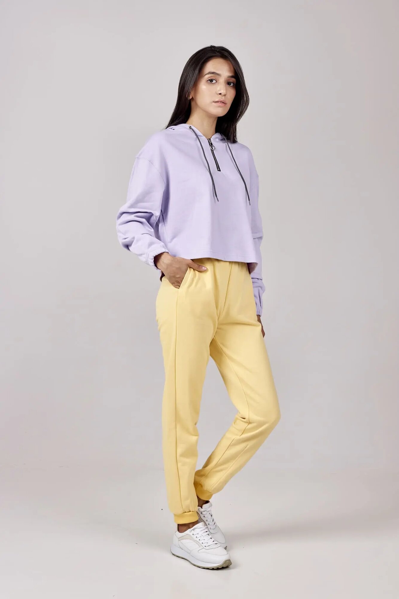 Стильное укороченное худи с акцентной застежкой на молнии. Модель имеет на капюшоне два металлических люверса под узорчатый шнурок и рукава на резинке для большего комфорта. К худи отлично подойдут джинсы или джоггеры.