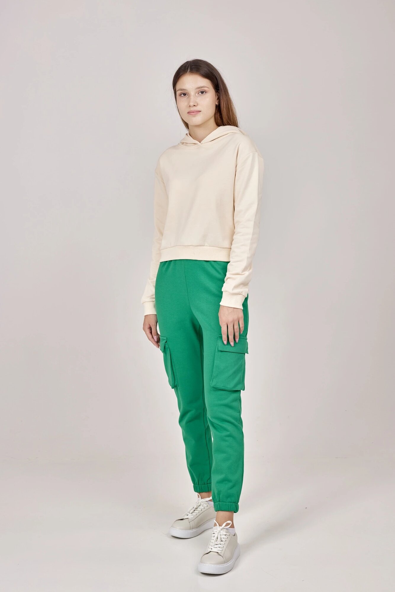 Однотонное укороченное худи свободного кроя со спущенной линией плеча и капюшоном, скроенным внахлест. Имеет нижний край и манжеты в рубчик. К нему отлично подойдут любые джинсы или джоггеры, а еще можно подобрать брюки из такого же трикотажа.