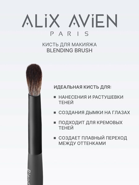 Кисти для макияжа от Alix Avien это роскошное качество и всегда идеальный результат. Линейка кистей для макияжа представлена в 9 вариантах для всех текстур и потребностей как профессионалов, так и для домашнего использования. Кисть для теней Blending brush от Alix Avien Paris идеальный помощник в макияже глаз. Кисть помогает в растушевке теней, позволит создать при макияже глаз эффект легкой дымки. Синтетический материал кисти для макияжа аликс авьен способствует ее долговечности, а классическая ручка в форме факела превращает процесс нанесения макияжа в удовольствие.