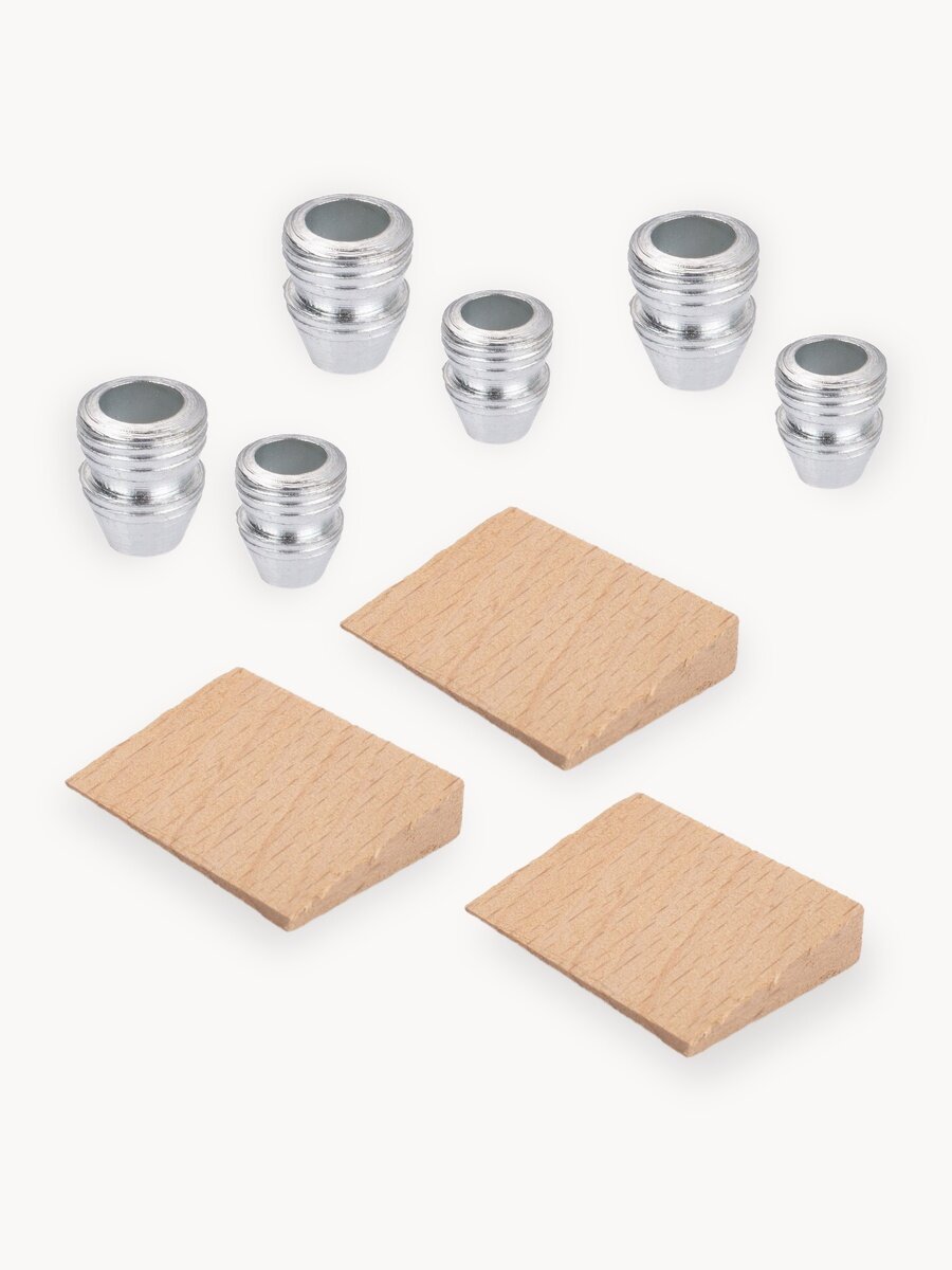 Набор клиньев для топора и молотка, классический деревянный из бука и кольцевой из легированной стали. Деревянный клин расклинивает топорище или ручку молотка по всей ширине, а кольцевой стальной клин надежно фиксирует деревянный и дорасклинивает топорище или ручку. Материалы: легированная сталь, бук. Примерные параметры: Деревянный клин. Ширина 42 мм. Глубина 31 мм. Толщина 6 мм. Кольцевой клин 1. Диаметр 12 мм. Длина 12 мм. Толщина стенки 2,2 мм. Кольцевой клин 2. Диаметр 10 мм. Длина 11 мм. Толщина стенки 20 мм. Вес набора 10 гр. Комплектация Деревянный клин 1шт, кольцевой клин стальной 2шт