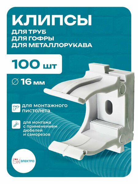 Клипсы для трубы 16мм применяются для крепления гофрированных и гладких труб к поверхности. Крепеж для гофры и труб диаметром 16мм от БК-Электро изготовлен специально для использования с монтажным пистолетом. Широкие лапки клипс гарантируют надежную фиксацию трубы (гофры) и исключают ее замятие. Крепление "ласточкин хвост" позволяет осуществлять блочный монтаж крепёж-клипс различных диаметров и облегчают проведение ремонтных работ для монтажника. Крепления для труб 16мм от БК-Электро - это проверенное временем решение отличного качества по приятной цене.