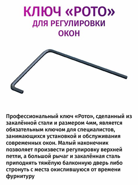 Профессиональный, Г-образный, шестигранный, 4 мм ключ для регулировки фурнитуры входит в набор инструментов мастеров по ремонту и обслуживанию современных окон и дверей из пластика ( ПВХ ) и дерева. Калёная сталь, повышенная прочность, строительный и регулировочный инструмент для мужчин и женщин. Ключ регулировочный шестигранник на 4 мм позволяет самостоятельно, без вызова мастера, произвести ремонт пластиковых окон (отрегулировать положение створки относительно рамы окна, а также усилить или ослабить прижим створки) Правильное положение створки позволяет увеличить срок службы фурнитуры. Регулировка прижима является средством устранения поступление в помещение холода и грязи зимой, а летом жары и пыли. Так же регулировка прижима позволит отремонтировать окно без замены уплотнителя для окон ПВХ. Правильно отрегулированная оконная фурнитура обеспечивает комфорт и продлевает срок службы пластиковых окон. Ключ так-же подходит для мебельных стяжек (конфирматов). Этот ключ один из базовых в мужском и женском наборе инструментов.
