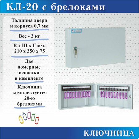 Ключница КЛ-20 предназначена для хранения 20 комплектов ключей. На задней стенке корпуса расположены отверстия для крепления. Ключница комплектуется 2 планками под навеску ключей. В дверь установлен замок типа «Cam-Lock». Ключница комплектуется 20 брелоками. Цвет: Серый.