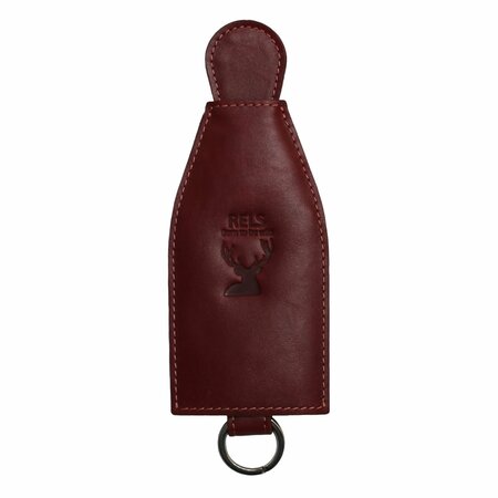 Ключница (Чехол для ключей), модель Condent (Кондэнт), коллекция Wild (Вайлд). Изготовлено из натуральной кожи. Цвет: бордовый (тёмно-красный, алый, винный) Сорт кожи: Druid (Друид). Конструкция изделия: металлическое кольцо для ключей закреплено на кожаном хлястике. При движении хлястика вверх, ключи полностью затягиваются вместе с хлястиком и кольцом во внутрь чехла. Для фиксации ключей и хлястика внутри чехла используется кнопка. При отстёгивании кнопки, ключи под тяжестью собственного веса выпадают из чехла. Облегчённая версия без использования подкладочного материала. Габариты изделия: 70x130x10 миллиметров. Упаковка: подарочная коробка RELS Born To Be Wild из плотного картона коричневого цвета.