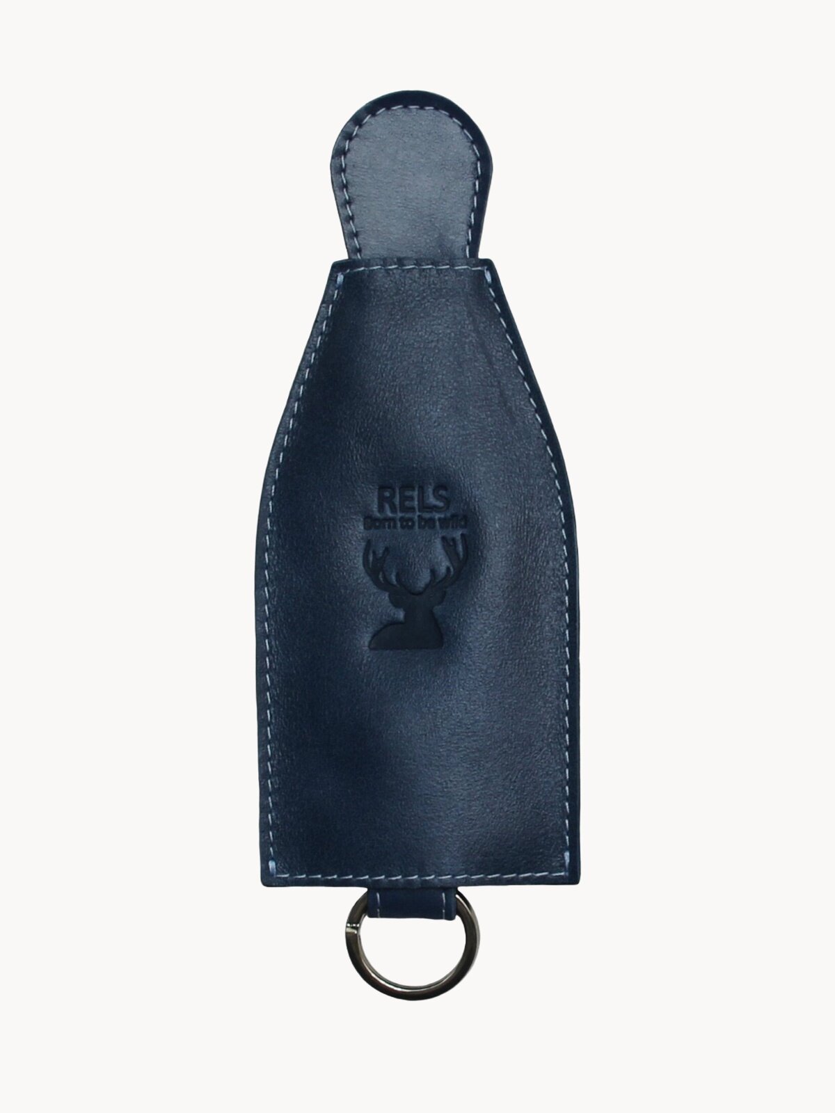 Ключница (Чехол для ключей), модель Condent (Кондэнт), коллекция Wild (Вайлд). Изготовлено из натуральной кожи. Цвет: синий (тёмно-синий, морской). Сорт кожи: Druid (Друид). Конструкция изделия: металлическое кольцо для ключей закреплено на кожаном хлястике. При движении хлястика вверх, ключи полностью затягиваются вместе с хлястиком и кольцом во внутрь чехла. Для фиксации ключей и хлястика внутри чехла используется кнопка. При отстёгивании кнопки, ключи под тяжестью собственного веса выпадают из чехла. Облегчённая версия без использования подкладочного материала. Габариты изделия: 70x130x10 миллиметров. Упаковка: подарочная коробка RELS Born To Be Wild из плотного картона коричневого цвета.