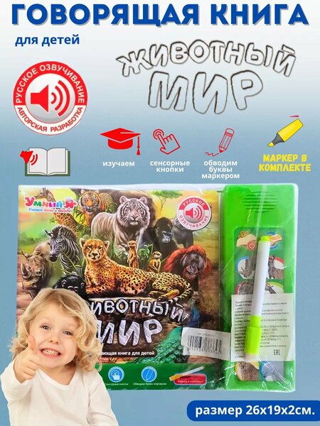 Книга «Животный мир» — это интерактивное обучающее пособие для детей от 3 лет. В ней ребёнок познакомится с различными видами морских обитателей, узнает их названия, особенности и интересные факты. Книга оснащена специальным смывающимся водным маркером, который позволяет рисовать и стирать рисунки без следов. Также в книге есть звуковые модули, которые воспроизводят звуки морских животных. Обучающая книга «Животный мир» изготовлена из высококачественных материалов и работает от батареек (в комплект не входят).