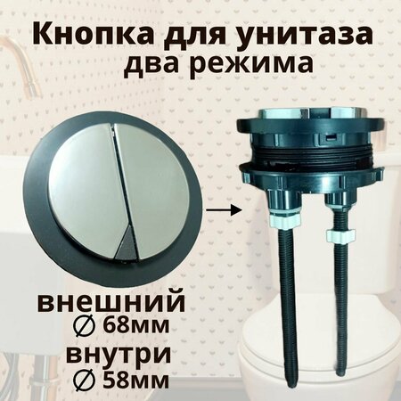 Кнопка для унитаза двойная, предназначена для замены вышедших из строя кнопок для бачка унитаза. Подходит для слива смыва воды в бачке двухрежимная или ее еще называют двойная клавиша для унитаза. Устанавливается на унитаз и ее можно регулировать под высоту и длину, регулировка зависит от размера самого бачка. Размеры: Длина стержней- 100мм. Общий диаметр- 68мм. Посадочный диаметр- 58мм. Внимание: на изделии могут присутствовать следы литья и неровности и выступы, это никак не влияет на эксплуатацию и не является дефектом.
