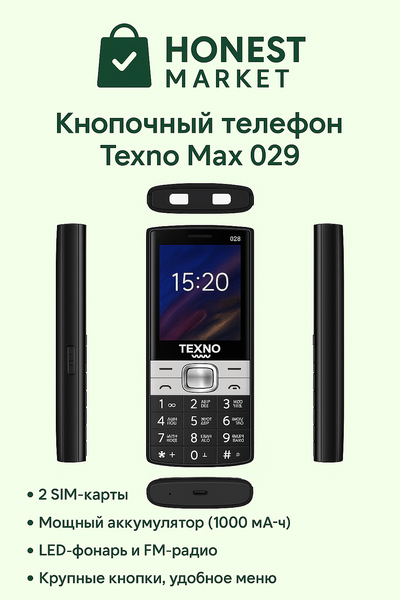 Описание товара: Texno Max 029 — надёжный и удобный кнопочный телефон, предназначенный для повседневного общения. Телефон поддерживает две SIM-карты, что позволяет использовать как рабочие, так и личные номера. Крупные кнопки и чёткий экран подойдут для любого возраста. Память можно расширить с помощью SD-карты. FM-радио, светодиодный фонарик и мощный аккумулятор ёмкостью 1000 мАч обеспечат длительное использование. Телефон имеет прочный корпус, хороший приём сигнала и громкий звук, что делает его очень удобным не только для обычных пользователей, но и для пожилых людей. Краткое описание: * SIM-карты: 2 (режим ожидания) * Мощный аккумулятор (1000 мА·ч) * Светодиодный фонарик и FM-радио * Поддержка SD-карт (microSD) * Крупные кнопки, удобное меню * Экран: 2,4 дюйма TFT * Размеры: 125 × 52 × 13 мм * Вес: 90 г * Динамик: есть * Поддержка карт памяти: microSD до 32 ГБ * Заряд держит до 7 дней * Простой интерфейс, удобный для пожилых людей * Мощный звук: звонки будут слышны четко * Прочный пластиковый корпус