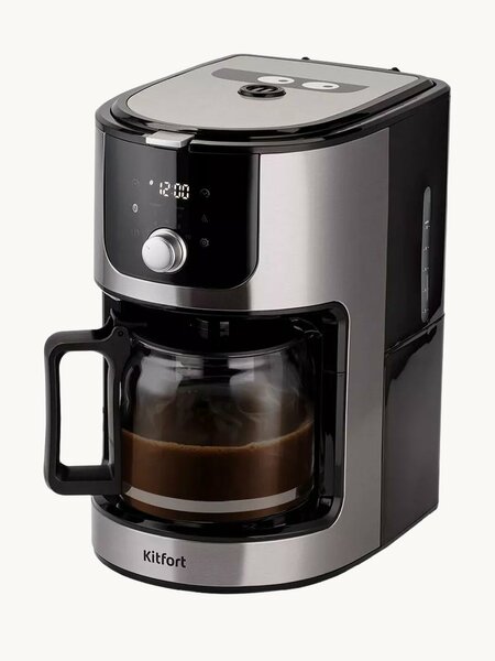 Капельная кофемашина Kitfort КТ-782 готовит ароматный кофе одним нажатием кнопки. Кофемашина предназначена для приготовления кофе в домашних условиях или в офисе. Встроенная кофемолка автоматически измельчит кофейные зерна сразу в фильтре. Кофеварка оснащена многоразовым нейлоновым фильтром, который удобно мыть после приготовления кофе и использовать снова. В комплекте идёт мерная ложка. У кофемашины КТ-782 есть LED-дисплей с понятными обозначениями всех программ. Вы можете видеть текущее время на часах на дисплее. Кофемашина оборудована противокапельной системой — затвором, приостанавливающим подачу кофе при вынимании кофейника из кофемашины. Вы можете налить кофе в чашку, не дожидаясь окончания приготовления. По окончании приготовления напитка кофемашина перейдет в режим подогрева. Платформа, на которой стоит кофейник с готовым кофе, будет горячей в течение 30 мин, затем кофемашина выключится. Звуковой сигнал известит вас об окончании работы платформы с подогревом. Резервуар для воды емкостью 1,2 л позволяет за один раз приготовить кофе на 6 больших (по 200 мл) или 10 маленьких (по 120 мл) чашек. Корпус кофейника прозрачный, поэтому вы всегда можете видеть, сколько кофе еще осталось. Больше не придется вставать на 20 мин раньше, чтобы успеть сделать кофе. Установите время автозапуска, и к моменту, когда прозвенит будильник, вас будет ждать свежезаваренный кофе. Резервуар для воды на 1,2 л оснащен мерной шкалой.