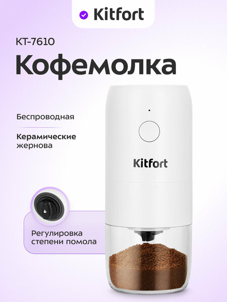 Быстрый и свежий помол кофейных зёрен Жерновая кофемолка КТ-7610 предназначена для помола кофейных зёрен. Устройство оснащено коническими жерновами из керамики, которые не стираются и не ржавеют со временем, а потому более долговечны. Настройка степени помола Жерновая кофемолка даёт равномерный помол и позволяет настроить его степень: от мелкого для эспрессо, до крупного для френч-пресса. Равномерный помол важен для приготовления кофе, особенно эспрессо. Зарядка устройства за 3,5 часа Управление кофемолкой осуществляется с помощью одной кнопки. Устройство работает от аккумулятора. Во время зарядки кофемолки индикатор заряда горит красным. При низком уровне заряда индикатор заряда будет мигать красным во время использования. Разборная конструкция Контейнеры для молотого кофе и для зёрен, а также внутренний жернов съёмные для удобства очистки. Контейнер для молотого кофе прозрачный, чтобы было удобнее контролировать количество содержимого. В комплекте предусмотрена щётка для чистки жерновов.