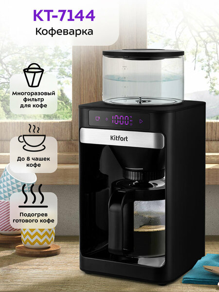 Капельная кофеварка КТ-7144 приготовит вкусный и ароматный чёрный кофе. В процессе приготовления вода нагревается в резервуаре, затем подкачивается помпой и подаётся в фильтр с молотым кофе. На резервуаре для воды и кофейнике нанесены соответствующие отметки, поэтому вам будет удобно отмерить количество воды, необходимое для приготовления желаемого количества кофе. Управление осуществляется при помощи двух кнопок на панели управления. Также кофеварка оснащена дисплеем. На нём отображается текущая температура воды в резервуаре, количество воды, подаваемой в фильтр, и время таймера подогрева. Многоразовый фильтр вмещает до 70 грамм молотого кофе, но рекомендуемое количество молотого кофе на 8 чашек кофе — 48 грамм. Фильтром можно пользоваться неограниченное количество раз. Воронка кофеварки оборудована системой «капля-стоп»: вы можете налить кофе в чашку, не дожидаясь окончания приготовления. Также у воронки есть регулятор интенсивности подачи кофе. Чем медленнее кофе поступает в кофейник- тем крепче получается кофе. Температуру воды для приготовления кофе можно настроить в диапазоне от 60 до 100 °C с шагом 5 °C. Температура воды контролируется термодатчиком, который встроен в дно резервуара для воды. По окончании приготовления кофеварка перейдёт в режим подогрева. Платформа с подогревом, на которой стоит кофейник с готовым кофе, будет горячей в течение 40 минут, затем кофеварка выключится.