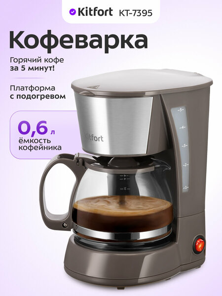 Вкусный кофе без хлопот! Капельная кофеварка КТ-7395 готовит ароматный чёрный кофе из молотого кофе. Управление кофеваркой очень простое и осуществляется при помощи одного переключателя. Прибор компактный и не займёт много места на вашей кухне. Простое приготовление При приготовлении кофе вода нагревается, а затем подаётся в фильтр с молотым кофе. Многоразовым фильтром можно пользоваться неограниченное количество раз. Пройдя через фильтр, кофе поступает в стеклянный кофейник. Сохранит тепло В месте установки кофейника находится платформа для подогрева. При работе кофеварки, включается нагревательный элемент, расположенный под платформой. Благодаря остаточному теплу платформа подогревает напиток в кофейнике некоторое время после выключения. Кофе хватит всем! Резервуар для воды ёмкостью 0,6 л позволяет за один раз приготовить кофе на 6 чашек (по 100 мл). На резервуаре для воды нанесены соответствующие отметки, поэтому вам будет удобно приготовить нужное количество чашек кофе. Удобный кофейник В комплекте с капельной кофеваркой КТ-7395 идёт стеклянный кофейник ёмкостью 0,6 литра. Вы всегда сможете увидеть, сколько кофе у вас осталось.