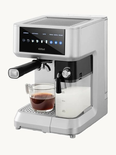 Бодрое утро! Кофеварка КТ-7545 поможет приготовить кофе: эспрессо, капучино или латте. Ключевым отличием рожковой кофеварки от всех прочих кофейных устройств является наличие рожка, его часто называют холдер. Кофе в 1 клик! Кофеварка оснащена современной панелью управления с несколькими режимами приготовления кофе, так что вас от заветной чашечки отделяет всего один клик! Хватит на всех Съёмный резервуар для воды имеет ёмкость до 1,6 литра, что позволит вам приготовить около 8 кружек кофе. Так же, съёмный механизм позволит вам заполнять резервуар отдельно от самого устройства в любом удобном месте. Пенка без труда Резервуар для молока имеет ёмкость 0,5 л, а также оснащён автоматическим капучинатором. При включении приготовления капучино или латте кофеварка автоматически взобьёт молочную пену и подаст её в чашку, а затем приготовит кофе. Быстрая очистка Нажатие на кнопку Чистка включает быструю очистку кофеварки и капучинатора. Чтобы включить полноценную очистку прибора - нажмите и удерживайте кнопку Чистка 3 секунды. Вся жидкость после очистки и приготовления кофе будет оказываться в поддоне для капель. Платформа для чашек Во время работы кофеварка нагревается и выделяемым теплом сможет нагреть и высушить ваши кружки. Так же, помимо этого, вы можете просто хранить любимые кофейные кружки на данной платформе. Полный комплект В полный комплект кофеварки входят: многоразовые фильтр, одинарный и двойной, которые устанавливаются в рожок, а также мерная ложка-темпер, которой вы сможете засыпать ровное количество кофе в рожок и сформировать таблетку обратной стороной.