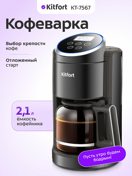 Искусство ароматного кофе! Капельная кофеварка — это отличный выбор для тех, кто любит ароматный черный кофе, приготовленный из молотого кофе. Она отличается компактными размерами и простотой в использовании, делая её идеальным решением для использования как дома, так и в офисе. Ваш идеальный утренний ритуал При приготовлении кофе вода нагревается, а затем попадает в многоразовый фильтр с молотым кофе. Медленно, по каплям, проходит через фильтр с кофе и попадает в кофейнике. Когда вся вода нагреется и пройдет через фильтр, кофе будет готов к употреблению. Поддерживаем тепло вашего кофе Кофейник оснащён платформой для подогрева, которая включается после приготовления кофе и поддерживает его горячим в течение до 2 часов. Вы также можете настроить время работы платформы на период от 0 до 4 часов перед началом приготовления. Система «капля-стоп» Воронка кофеварки KT-7567 оборудована противокапельной системой. Вынимая кофейник из кофеварки, затвор приостанавливает подачу кофе. Это позволяет налить кофе в чашку, не дожидаясь завершения процесса приготовления. Понятное управление Дисплей на кофеварке позволяет узнать текущее время или установить таймер подогрева. Функция «Отложенного старта» даёт возможность запланировать приготовление кофе на определённое время. Например, вы можете настроить таймер к вашему пробуждению. От нежного до бодрящего! Кнопка «Настройки» также служит для циклического переключения крепости кофе. Вы можете выбрать между некрепким, средним и крепким кофе. Соответствующие надписи будут отображаться на дисплее: «BOLD: L», «BOLD: М» и «BOLD: Н». Хватит на всех! Объём резервуара для воды составляет 2,1 литра, что позволяет приготовить 14 чашек кофе по 150 миллилитров за один раз. Кофейник выполнен из прозрачного стекла, что позволяет легко контролировать уровень кофе.