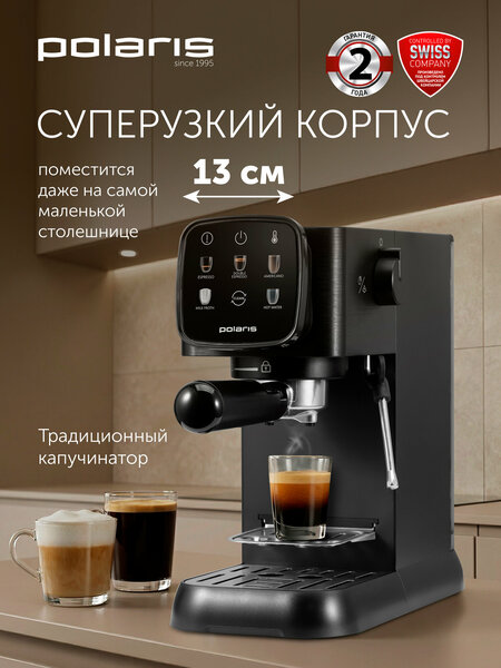 Элегантность и совершенство в каждой чашке: рожковая кофеварка PCM 1551E Adore Crema нового поколения. Рожковая кофеварка в ультратонком корпусе оснащена сенсорным дисплеем, который делает процесс приготовления кофе интуитивно понятным и приятным, итальянской помпой ULKA с давлением 19 бар, электронным контроллером с датчиком NTC, который гарантирует точность температуры и стабильное качество каждого приготовленного эспрессо и удобной ручкой управления для подачи пара и горячей воды. Термоблок с системой нагрева из нержавеющей стали обеспечивает быстрый и равномерный нагрев воды, гарантируя стабильную температуру для идеального напитка. Паровая насадка для приготовления нежной молочной пены – идеальное дополнение к вашему капучино или латте. Функционал кофеварки включает в себя автоматическое дозирование эспрессо (одинарная/двойная порция) в соответствии с запрограммированным объемом и регулирование объема кофе, что позволяет настроить крепость и насыщенность напитка по вашему вкусу, а также функцию предварительного нагрева для поддержания идеальной температуры кофейных чашек. В комплекте все необходимое: съемный прозрачный резервуар для воды объемом 1.1 л, съемный поддон для капель с крышкой из нержавеющей стали, фильтры для одинарной и двойной порции эспрессо из нержавеющей стали, мерная ложка с тампером. Эта рожковая кофеварка – это не просто устройство, это инвестиция в ваше кофейное наслаждение! Наслаждайтесь идеально приготовленным эспрессо каждый день, не выходя из дома.