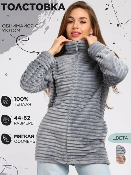 Теплая кофточка с длинным рукавом – это идеальный выбор для прохладной погоды. Ультрасофт трикотаж делает ее невероятно мягкой и уютной, а начес внутри добавляет дополнительное тепло. Благодаря оверсайз крою и свободному силуэту она подходит для женщин с разными типами фигуры, включая будущих мам и обладательниц больших размеров. Высокий воротник на замке обеспечивает защиту от ветра, а удобные карманы делают модель практичной для повседневных прогулок. Эта базовая одежда без рисунка станет стильным решением для зимы или ранней весны. Ее однотонный дизайн подчеркивает лаконичность и элегантность, что позволяет легко комбинировать с другими элементами гардероба. Длинная толстовка прекрасно держит форму благодаря высокому качеству материалов и аккуратному пошиву из Иваново. Отсутствие капюшона придает модели классический вид, а высокий воротник делает ее особенно комфортной в холодную погоду. Плюшевая структура ткани напоминает объятия бабушкиного уюта, даря тепло и заботу каждой девушке. Практичная кофточка создана для улицы или дома: она утепленная, удобная и долговечная. Российское производство гарантирует надежность и соответствие высоким стандартам качества. Однотонная структура изделия подчеркивает универсальность модели – от прогулок до отдыха на природе.