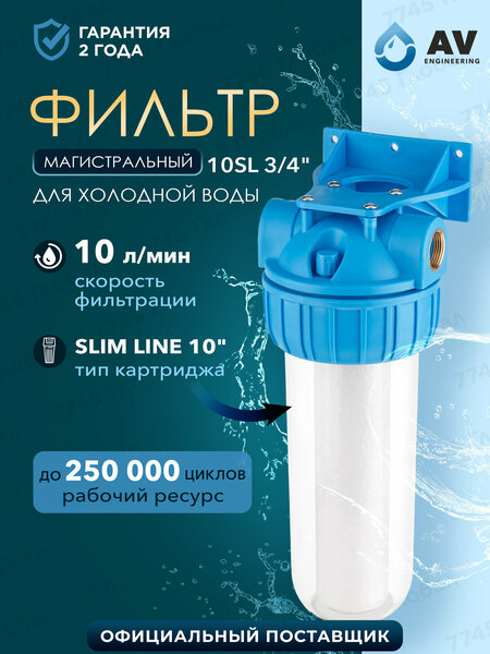 Фильтр магистральный AV ENGINEERING 10SL 3/4" (AVE119H34) обладает рабочим ресурсом до 250 000 циклов и обеспечивает стабильное функционирование при рабочем давлении 8 бар и максимальном давлении 16 бар. Латунный фитинг гарантирует надёжность соединения, а рабочая температура от +2 до +45 градусов позволяет использовать фильтр в различных условиях. Тип картриджа — slime line 10 дюймов, с максимальной производительностью 10 литров в минуту. В комплект поставки входят картридж, кронштейн и ключ для удобства установки и обслуживания фильтра.