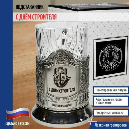 Комплектация: Подстаканник (никелированная латунь марки Л68), Стакан (Хрусталь, 220 мл), Подарочная коробка (15 х 12 х 12 см). Производитель подстаканника: Кольчугинский мельхиор (г. Кольчугино, Владимирская обл, Россия). Производитель стакана: Бахметьевский завод (г. Никольск, Пензенская обл, РФ). Способ нанесения рисунка: Лазерная гравировка (нанесена на лицевую часть подстаканника). Высота подстаканника со стаканом: 12 см. Внешний диаметр подстаканника: 7,1 см. Внутренний диаметр подстаканника: 6,7 см. Диаметр наиболее широкой части стакана: 6,6 см. Объём: 220 мл. Вес: 180 г. Размер: 12 x 10 x 8 см. Каждый фрагмент оформления изображения на железе выполнен методом художественно штамповки. История подстаканников неразрывно связана с железнодорожным транспортом, где они вместе с граненым стаканом из стали неотъемлемым элементом сервировки стола в поездах ржд с советских времен. Подарочный металлический подстаканник дополнит интерьер, служа практической функции, защищая руки от ожога и обеспечивая устойчивость в движении. Не просто элемент декора, но еще и отличный сувенирный подарок для любителей путешествий по России. Атрибут чайных встреч, который тесно связан с атмосферой путешествий и уютом времен СССР. Престижный презент в старинной стилистике идеально подойдет к любому торжественному событию: 8 марта, 23 февраля, Новому году или Дню рождения. Мама, папа, муж, жена, коллега - каждый будет чувствовать себя особенным и любимым.